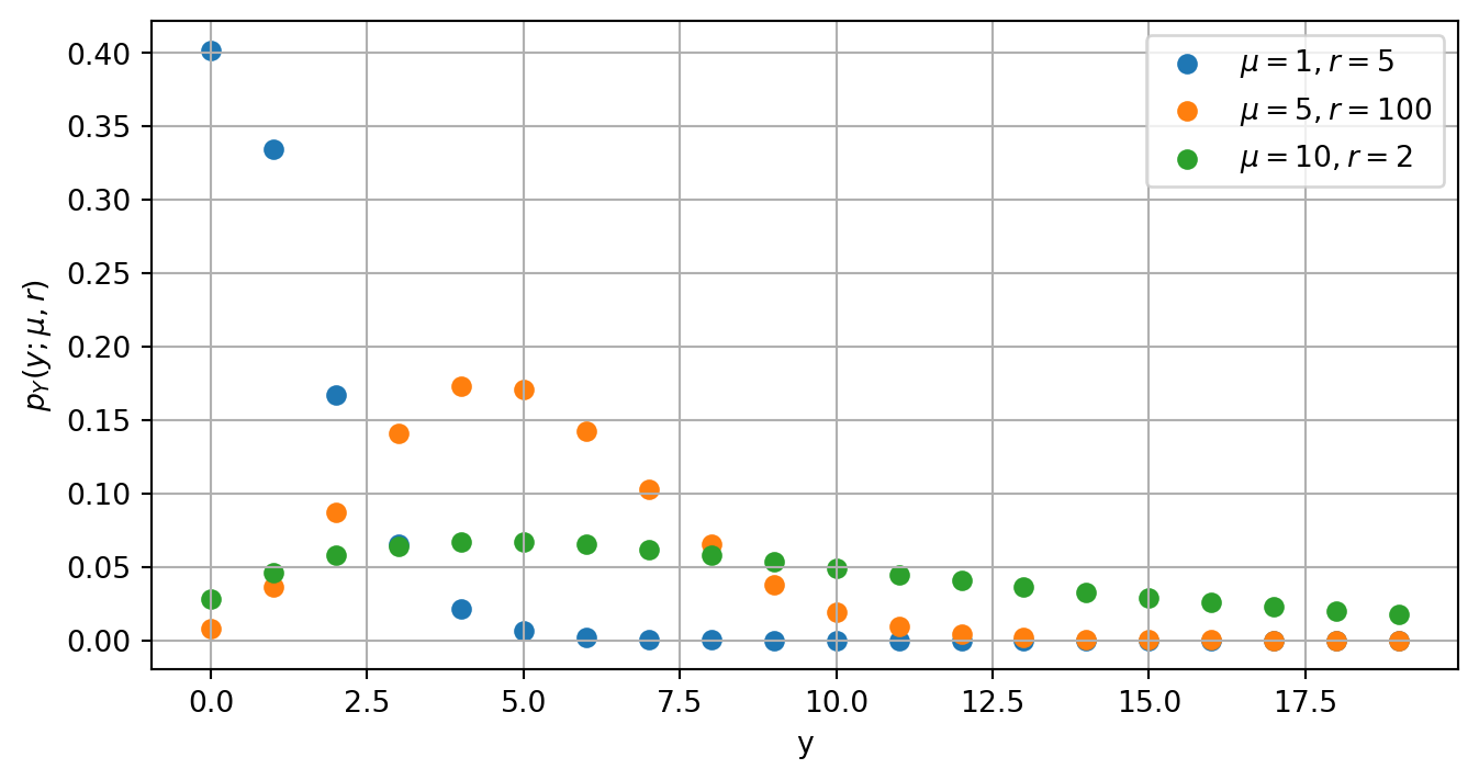 import torchimport matplotlib.pyplot as pltnbinom_pdf =lambda y, mu, r: (torch.lgamma(y + r) - torch.lgamma(r) - torch.lgamma(y +1) + r * torch.log(r) + y * torch.log(mu) - (y + r) * torch.log(r + mu)).exp()y = torch.arange(0, 20)mu_values = torch.tensor([1, 5, 10])r_values = torch.tensor([5, 100, 2])fig, ax = plt.subplots(figsize = (8, 4))for i inrange(3): mu = mu_values[i] r = r_values[i] pmf = nbinom_pdf(y, mu, r) ax.scatter(y, pmf, label=fr"$\mu={mu.item()}, r={r.item()}$")ax.grid()plt.xlabel("y")plt.ylabel(r"$p_Y(y; \mu, r)$")plt.legend()