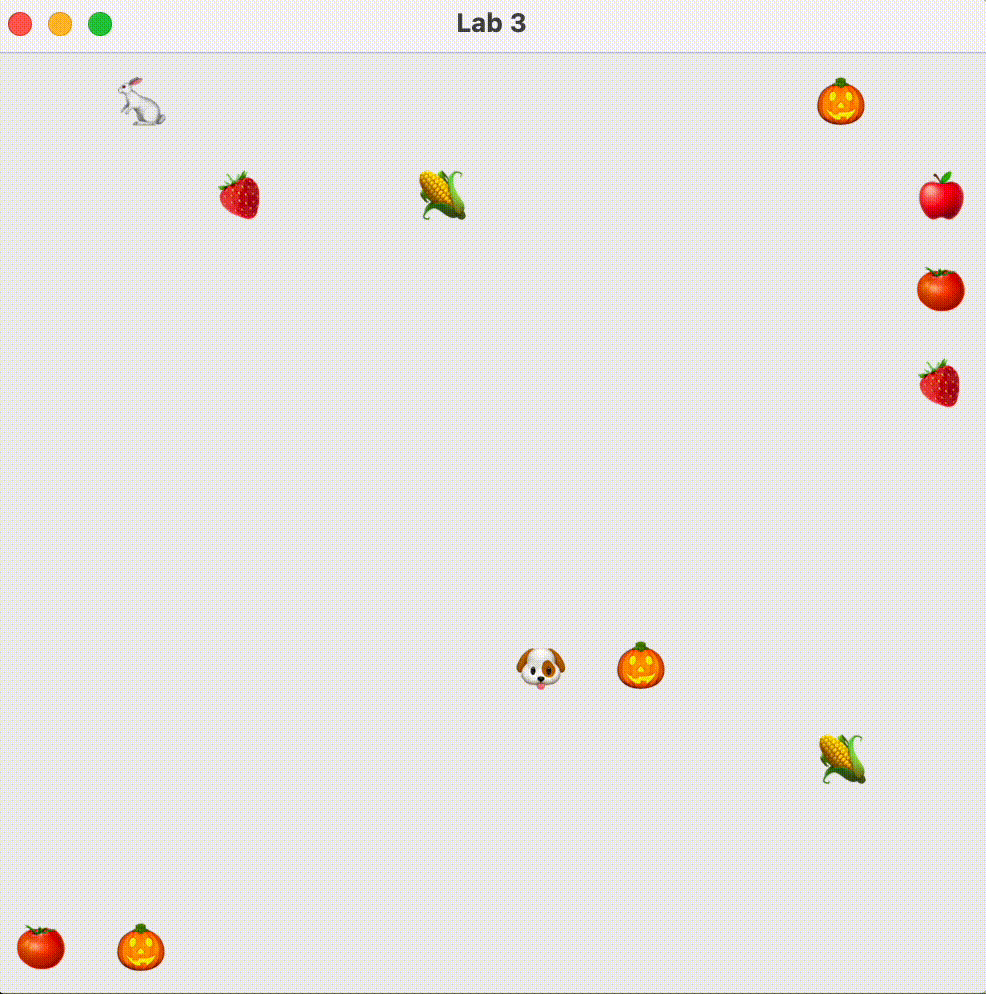 In this lab, we will implement a game in which a bunny (the Player) is roaming around someone’s garden trying to gather food items. There is also a dog in the garden who is trying to catch up to the bunny (in a pretty random way).