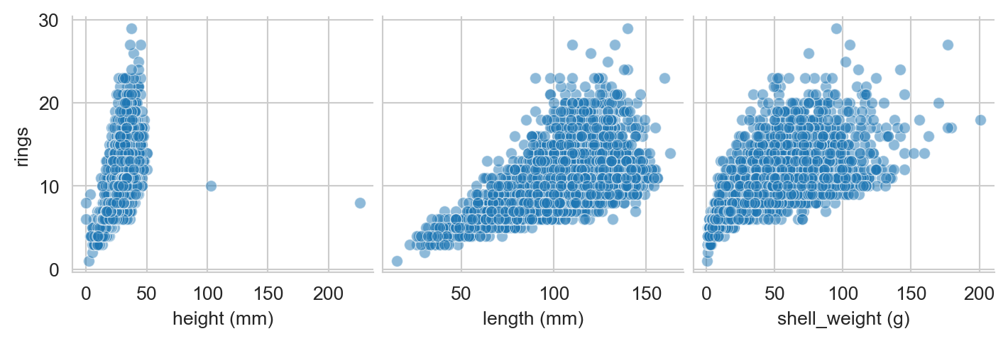 The sex column is qualitative (Male, Female, Infant), while the other columns give numerical units. The length, diameter, and height columns are in millimeters, while the whole_weight, shucked_weight, viscera_weight, and shell_weight columns are in grams. The rings column gives the number of rings on the abalone’s shell, which is our target variable. If we take a look at a few of the numerical columns, we can see that they tend to correlate with rings, giving us hope that we can use them as predictors: