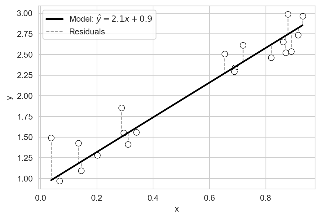 plt.show()Each of the models gives different predictions \(\hat{y}\) given the same input \(x\). How do we determine which of these models is “best”? A reasonable intuition here is that a good model should make predictions \(\hat{y}\) which are close to the obserevd outputs \(y\) on average. One way to express the idea of closeness is to consider the residuals \(r_i = y_i - \hat{y}_i\), which measure the difference between the observed output \(y_i\) and the predicted output \(\hat{y}_i\) for each data point \(i\):