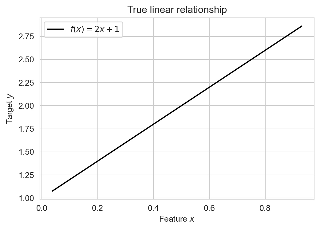 For example, suppose we have a numerical input \(x\) and a numerical output \(y\), and suppose we knew that the input \(x\) and the output \(y\) were related according to the following linear relationship: