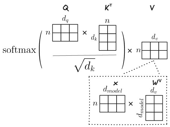 \[ \text{Attention}(Q,K,V) = \text{softmax}\left( \frac{QK^T}{\sqrt{d_k}} \right)V \]