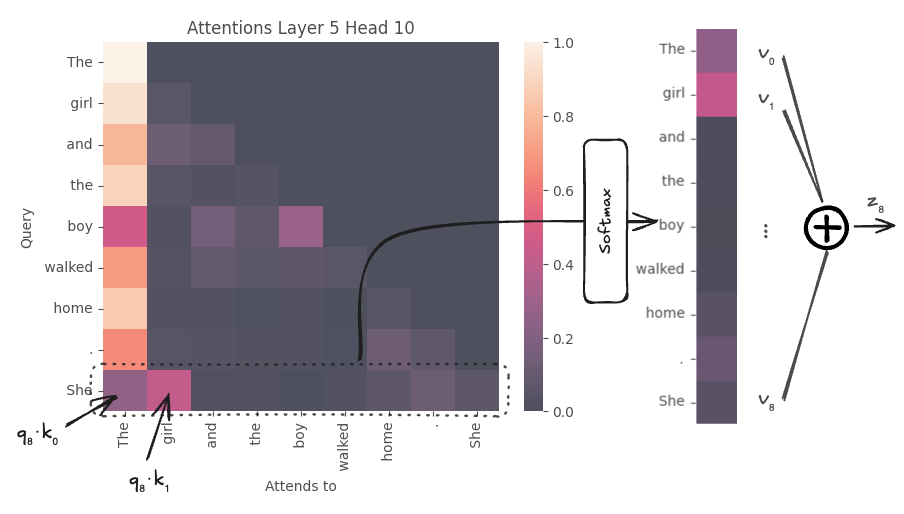 Let’s trace through the attention calculation for the token “She” in this attention head. “She” is the query, i.e., \(q_8\). Each element in that corresponding row of the attention weights (row at index 8 in the heatmap) corresponds to the dot product between the query vector for “She” and the key vectors for “She” and all preceding tokens in the sequence (e.g., \(k_0\) for “The”, \(k_1\) for “girl”, …), scaled and normalized via softmax. The resulting distribution is used to compute a weighted sum of the value vectors to produce \(z_8\), the output representation for “She” from this attention head. Specifically for this head, \(z_8=0.25v_0 + 0.41v_1 + \ldots\), i.e., primarily incorporates information from \(t_0\) and \(t_1\), “The” and “girl”.
