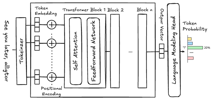 The original application was for machine translation, and so “Attention is All You Need” proposed an encoder-decoder architecture (the encoder processed the source language, while the decoder generated the target language). Models such as GPT2, our example here, only use the decoder portion for generative language modeling tasks while other models use different subsets (e.g., just the encoder portion) of the full Transformer architecture. Today we will focus on GPT2 and decoder-only models for next-token prediction, but we note that many variants of the Transformer architecture exist.