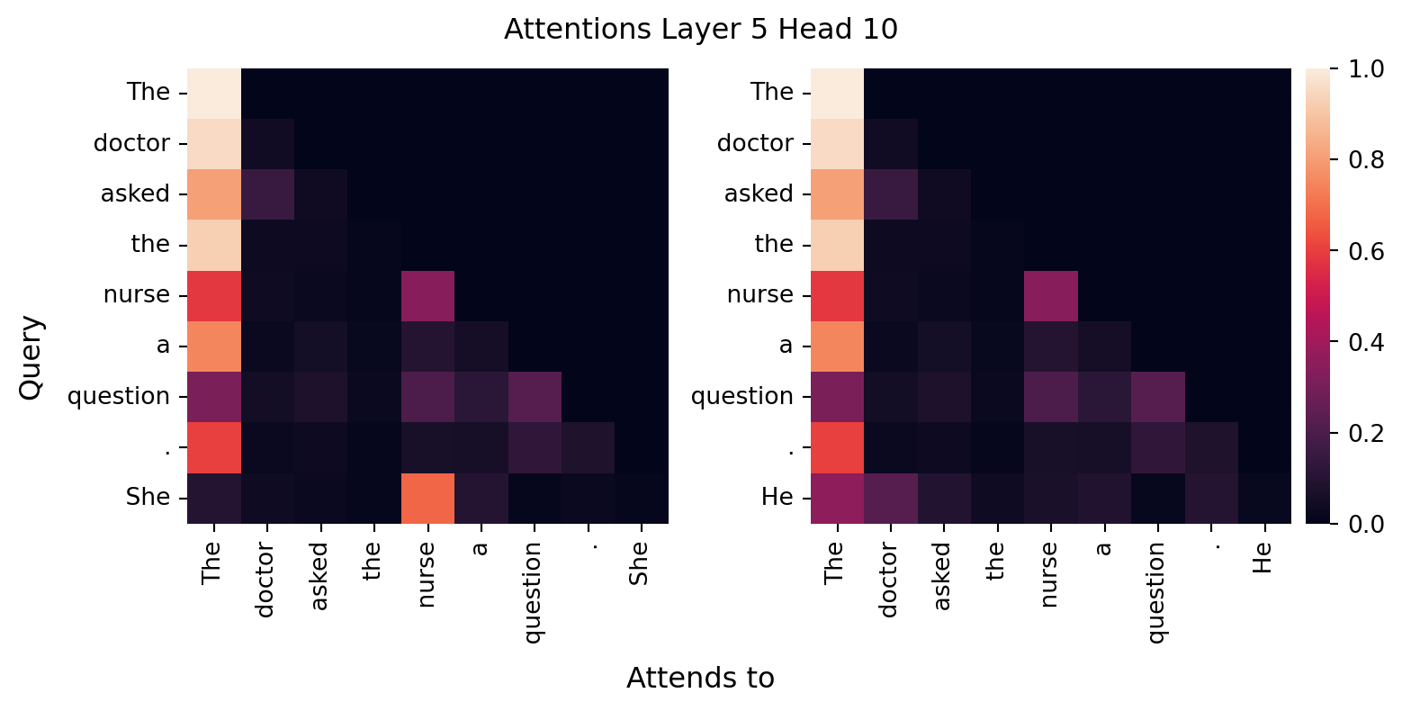 When considering Markov models outputs, we noted that for sufficient context lengths, the model would simply reproduce training data verbatim. But that text was not actually stored somewhere in the model (i.e., in a variable or data structure), rather the training data was encoded as next token probabilities, i.e., \(P(t_i | t_{i-1}. \ldots, t_1)\). The same is true for GPT2, just with many more parameters and a much larger training dataset (40 GB of text data from the Internet). That is recurring patterns in the training data, i.e., recurring patterns in society (as reflected in Internet text), will be encoded in the model parameters. Consider the “The doctor asked the nurse a question. She”. What “attends to” pattern do you expect GPT2 learned for “She”? What if we replaced “She” with “He”?