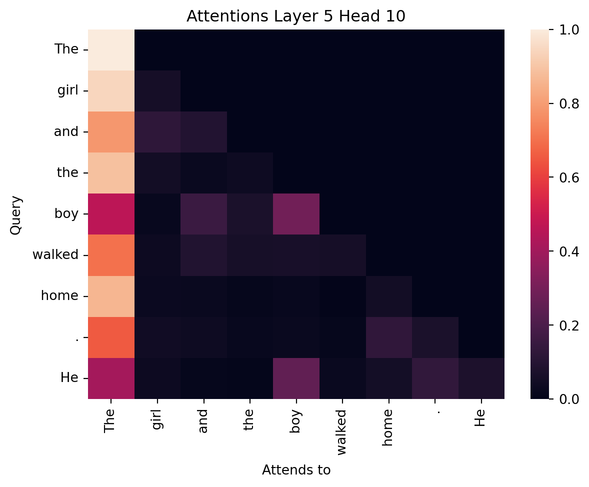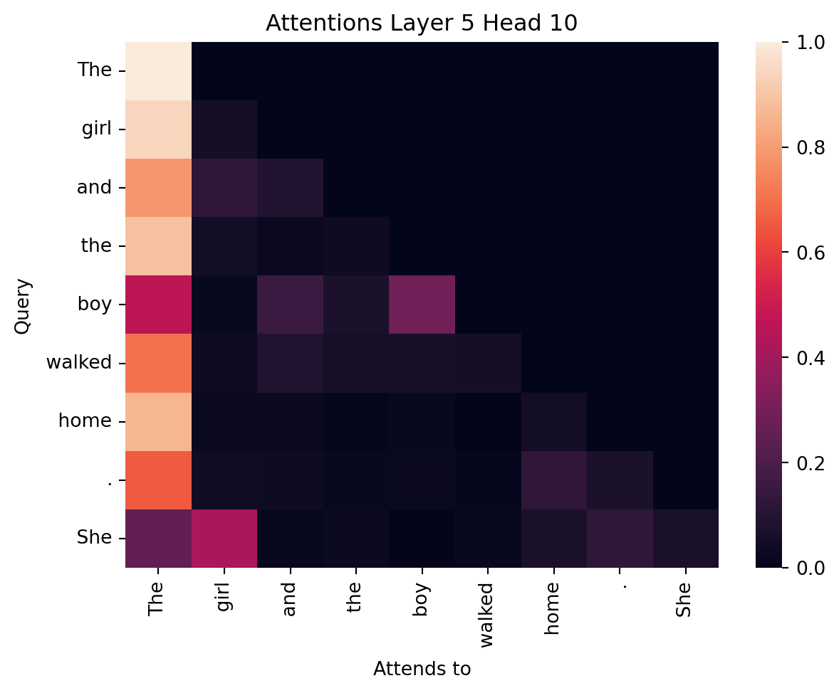 return axConsider the following input sequence “The girl and the boy walked home. She”. . What are the relevant tokens that “She” should “attend” to understand this sentence? We interpret “She” in the second sentence as referring to the “girl” in the first sentence and so would expect that the attention weights (for some layer and head) would reflect this relationship. And indeed we can see in the attention weights for layer 5, head 10, the token “She” (last row) attends strongly to “girl” (second column).